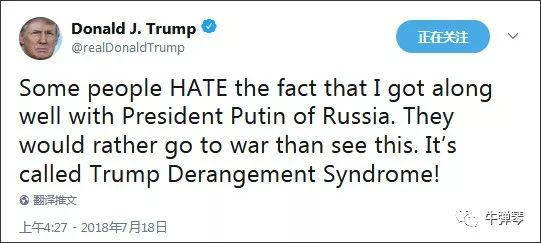 作为推特驻白宫的首席记者,在忙军国大事的间隙,特朗普还发了多条推特,其中一条更是这样辩护:有些人讨厌我和俄罗斯总统普京相处得很好。他们宁愿去打仗也不愿看到这一切。这叫做特朗普精神错乱综合症!