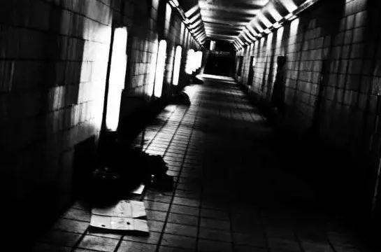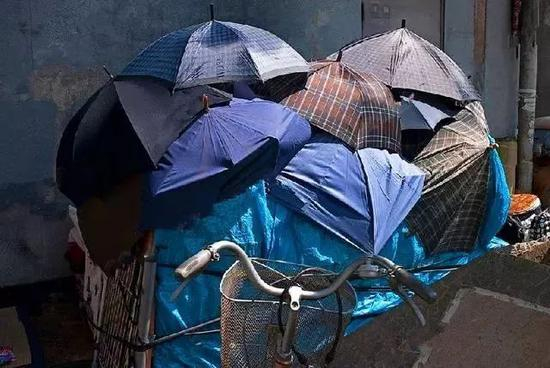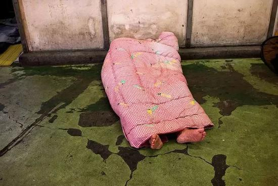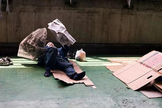 缩在墙角里睡觉的无家可归者,用雨伞隔出一片属于自己的天地。