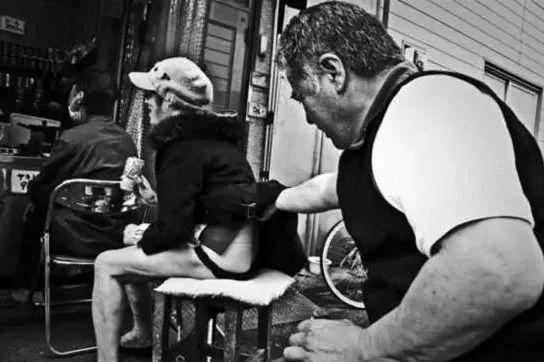 清晨,一名黑帮成员正在用剃须刀刮手臂,手臂上的纹身醒目。