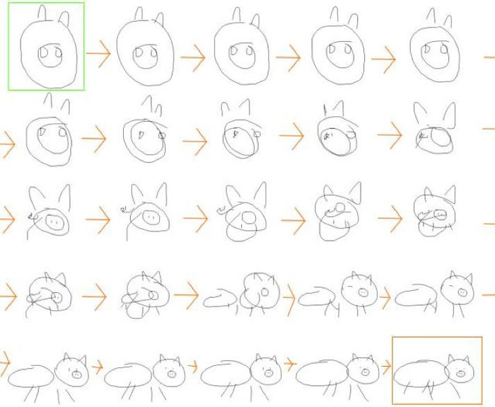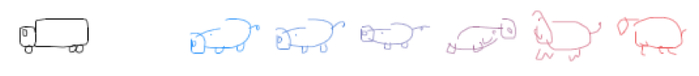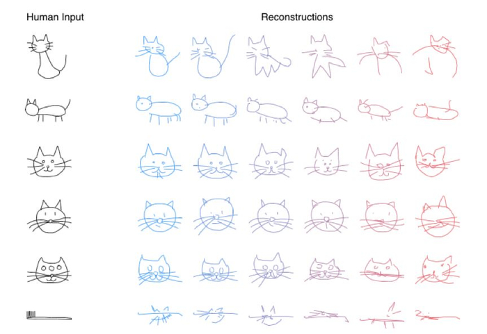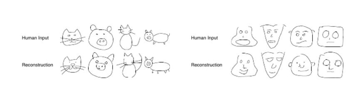 研究人员在人类涂鸦数据集中训练神经网络,让AI来理解人们在绘制涂鸦时是在何时起笔、走笔方向、何时停笔的。当经过训练的RNN模型接收到人类绘制的涂鸦后,会生成一张类似的新涂鸦: