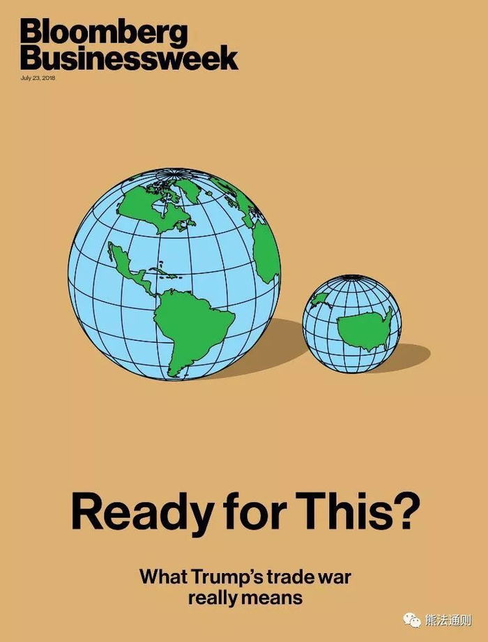 《彭博商业周刊》讲的是特朗普的贸易战,封面将大地球上的美国剪掉了,贴在小地球上面——小地球上只有美国一个国家,大地球上唯独没有美国: