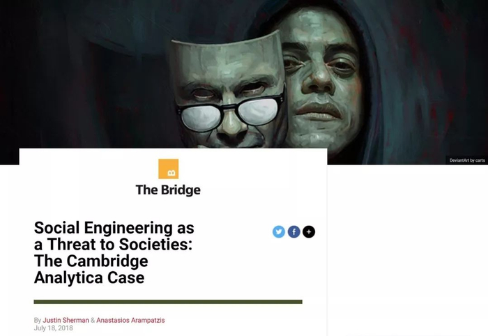 社会工程是全世界的黑客最受欢迎的工具,历史上它曾以面对面的形式,或通过电话、印刷书写来实现,但现在它可以通过社交媒体和其他互联网平台在社会大规模实践。平台设计者可能并不打算将用户的数据用于经济剥削和政治操纵,但最近有关剑桥分析使用Facebook数据的披露,揭示了这种全球威胁的征兆。