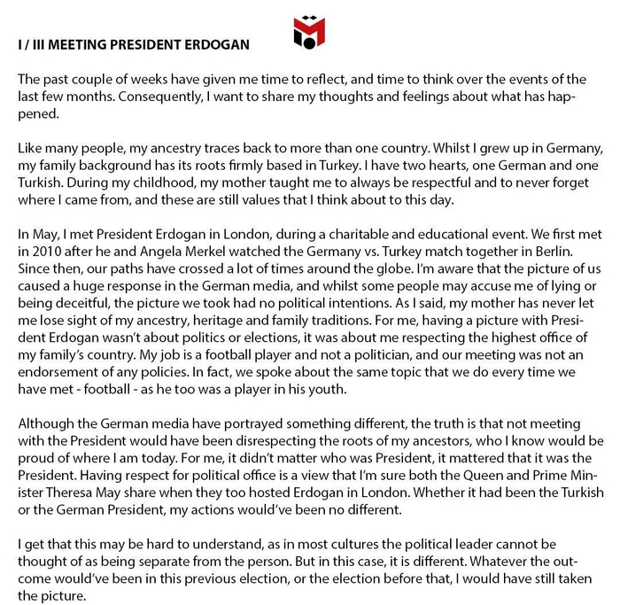 在第一封声明中,厄齐尔正面回应了自己与土耳其总统合影一事。