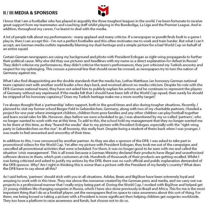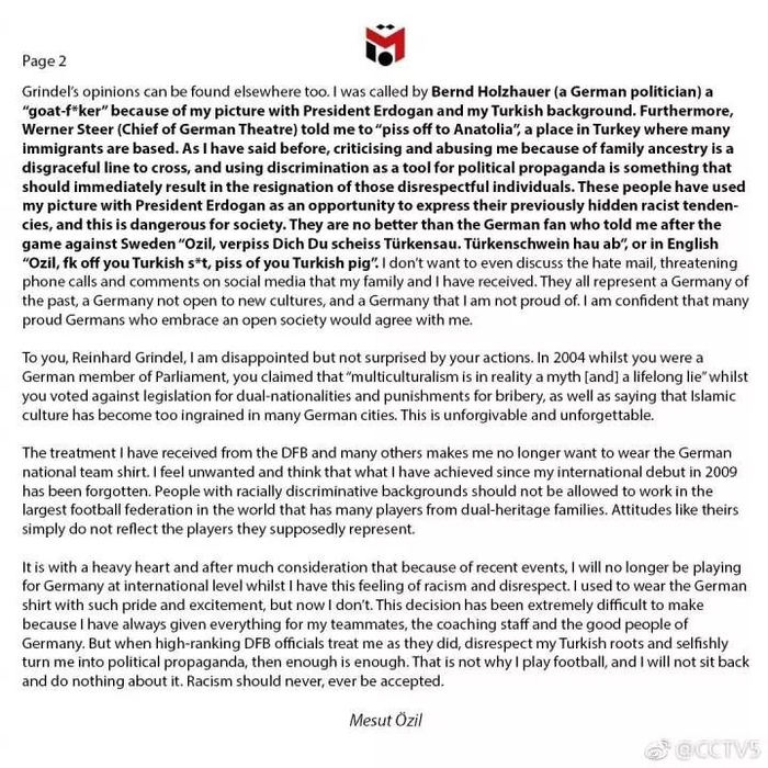 在第二封声明中,厄齐尔指责了一些德国媒体和赞助商对他的不公待遇。