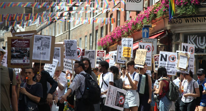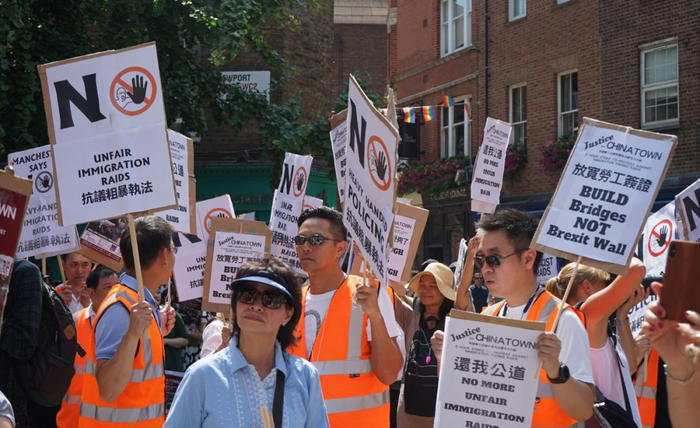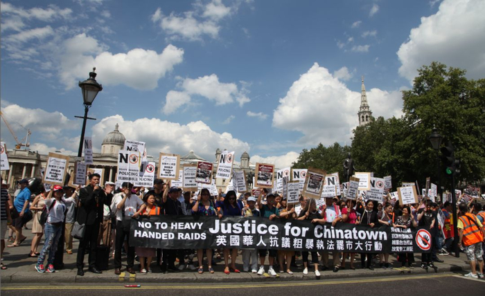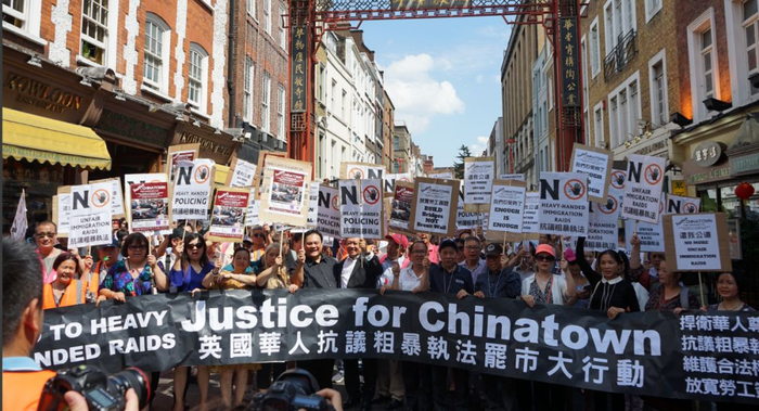 此次超大规模的罢市游行示威,主要是针对7月初,英国警方突袭唐人街,搜查黑工,暴力执法一事,事发当时,英国移民官员还与华人发生肢体冲突,场面一度混乱,官方车辆竟险些撞到一名躺在地上的华人老人。伦敦华埠商会因此紧急发布通知:(见图)