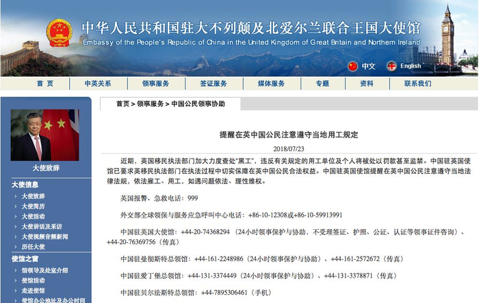 就在昨天,7月23日,中国驻英国大使馆也就此事发布通知: 提醒在英中国公民注意遵守当地用工规定。