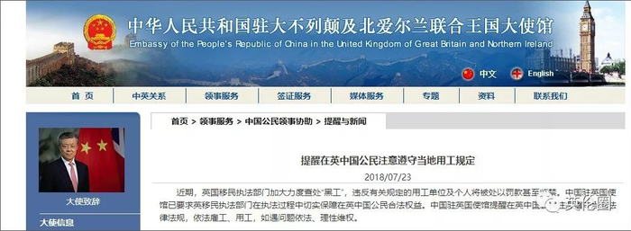 就在昨天(7月23日),中国驻英国大使馆也就此事发布了通知,提醒在英中国公民注意遵守当地用工规定: