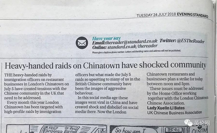 李雪琳在《旗帜晚报》撰文表示,7月5日在唐人街的暴力搜查行动加剧了移民局与英国华社的紧张关系。