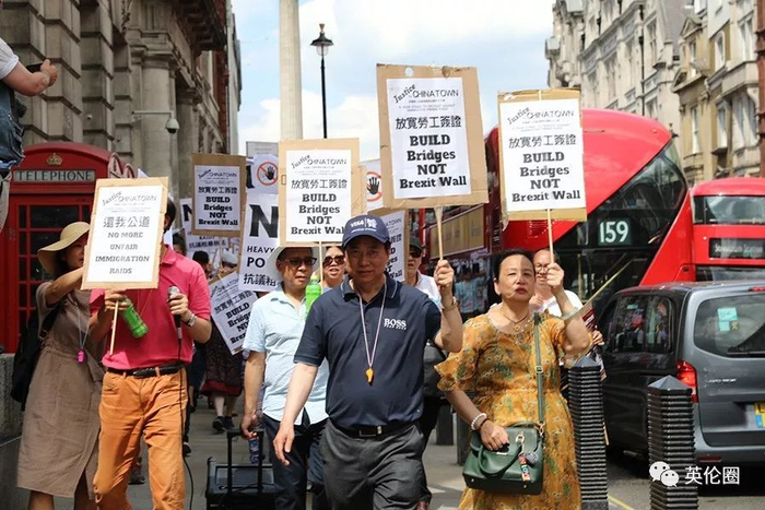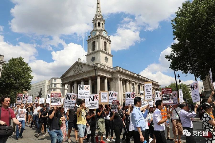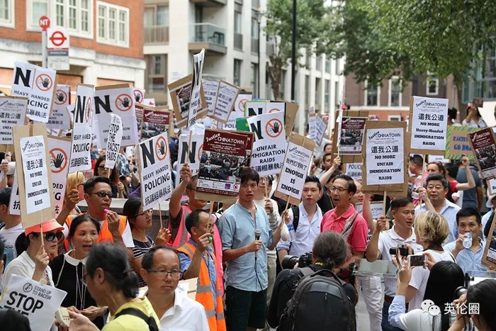 游行队伍高喊“还我公道”、“反对钓鱼执法”、“反对粗暴执法”、“反对歧视”和“放宽劳工限制”的口号,一路经过特拉法加广场、白厅、威斯敏斯特宫,在下午2点15分抵达内政部门口。