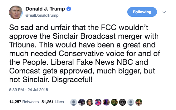 在晚上回到白宫后,特朗普却一反早上“轻快”的风格,发推特表达不满。他斥责联邦监管机构,称其阻止美国辛克莱和论坛报传媒公司合并的行为“可耻”。特朗普写到,“这是人们需要的保守派声音。自由派假媒体合并都被批准了,凭什么辛克莱不行?可耻!”