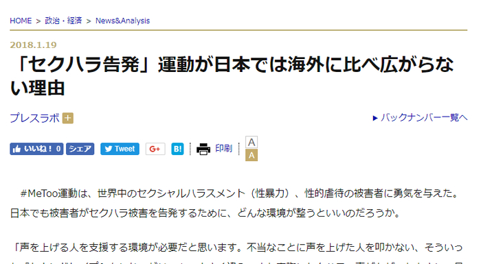 日本“Diamond Oline”也发表文章,分析为何日本的#Metoo运动没有像欧美那样广泛开展的问题。该媒体认为,“首先必需要有支援发声的环境”。文章指出,伊藤诗织事件中,很多大媒体都选择了噤声,主流媒体没有报道该事件,甚至也没对检察机关的做法进行批判。反而,伊藤收到了很多抨击其言论的邮件,日本舆论界站出来鼓励她的人很少。