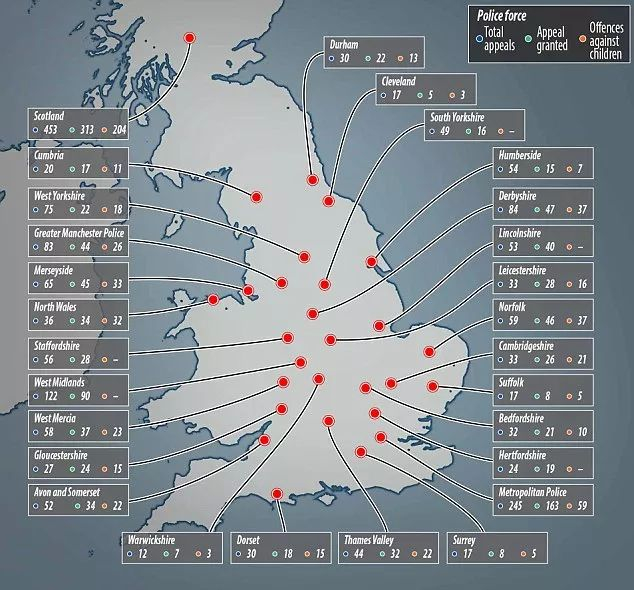 在坎布里亚郡,20名罪犯提出上诉,17名(85%)成功被成功移除。被移除者中有11人(65%)涉及16岁以下的受害者。