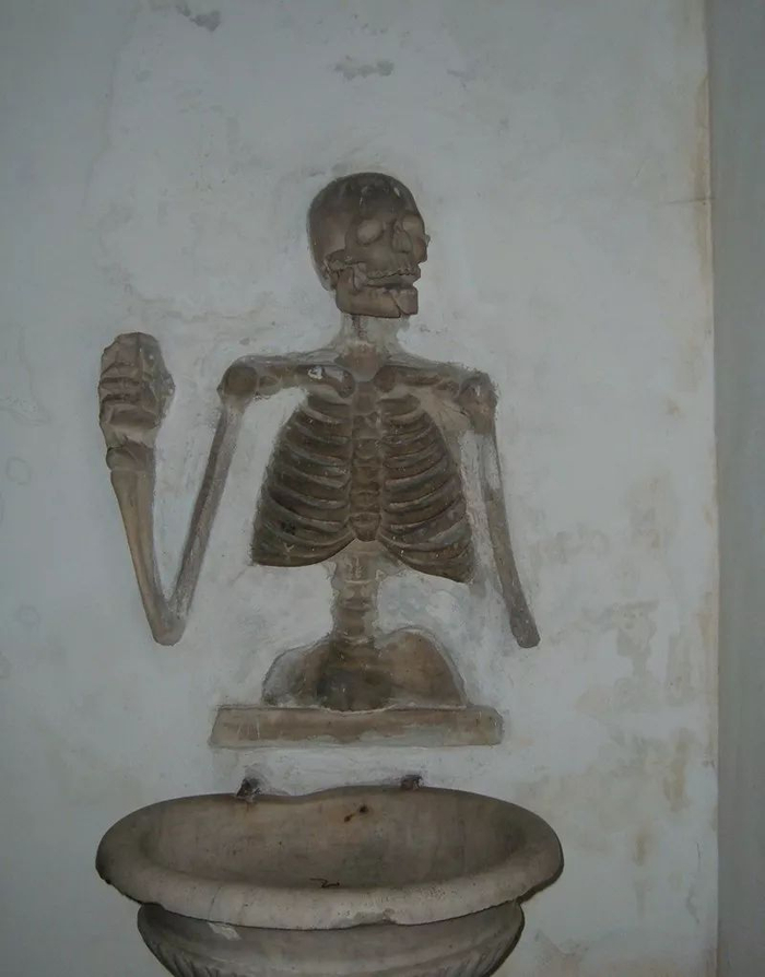 在教堂放置圣水盆附近的墙壁上,还嵌着一副人骨!旁边则用拉丁文写着“今天是我(死),明天到你(死)”。