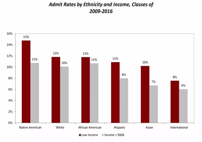 再者,红色一栏代表收入超过6万美元的家庭学生,但即便亚裔学生家庭收入和其他族权一样高,亚裔学生录取率还是低,这意味着哈佛大学照顾美国族群利益,比照顾高收入者利益更为看重。
