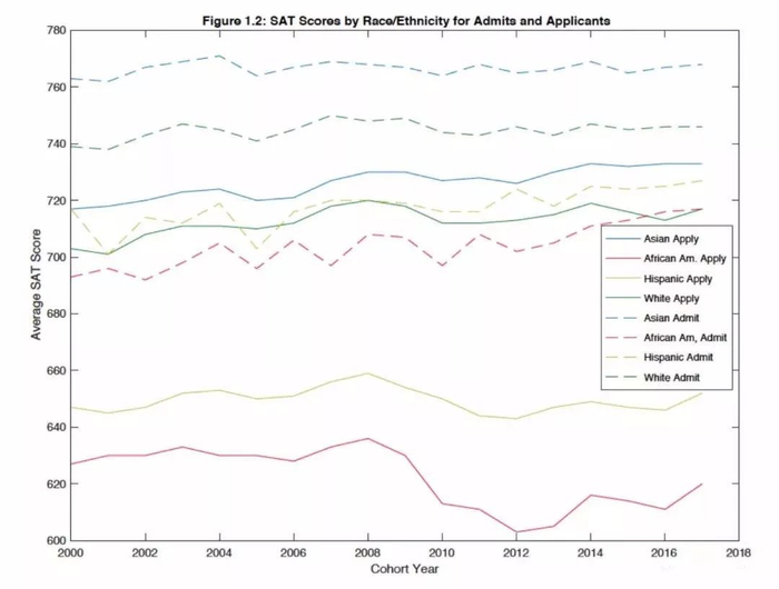 据SFFA的报告显示:整个亚裔申请人在许多客观条件方面比任何其他族裔群体都更强,包括SAT统考成绩,学业成绩和课外活动。