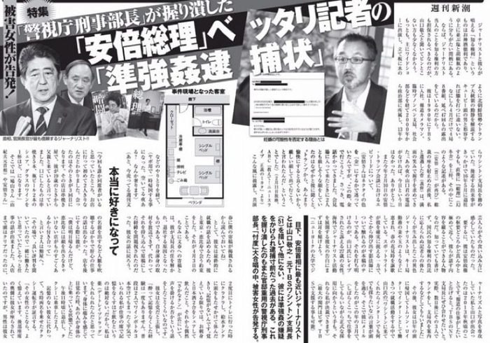 2017年5月18日、5月25日,《周刊新潮》连续两周刊出报道,标题分别为《警视厅刑事部长将安倍贴身记者的准强奸逮捕令捏碎》,《接到准强奸逮捕令的安倍总理贴身记者,被昭惠夫人点赞的“女性之敌”》,报道中将伊藤诗织称为“被害女性”。