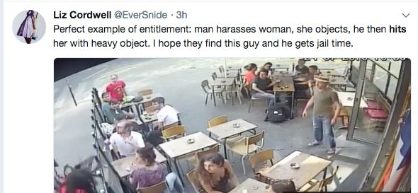 “晚上7点左右,我路过一家咖啡店,一名男性迎面走来,说一些污秽词句羞辱我,还吹口哨。我边走边回了句‘闭嘴’。他听到后竟然追上来拿起一个烟灰缸朝我的脸甩过来,还好我闪躲过去了。”