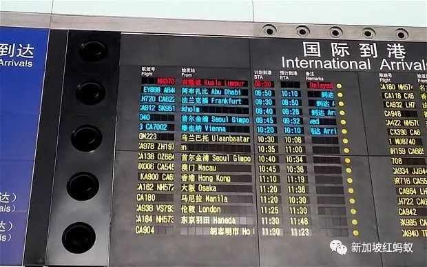 2014年3月8日上午,北京首都国际机场大厅的到港航班信息屏幕上,用红色标注的MH370航班“延误”状态,格外引人注目。(互联网)