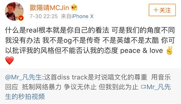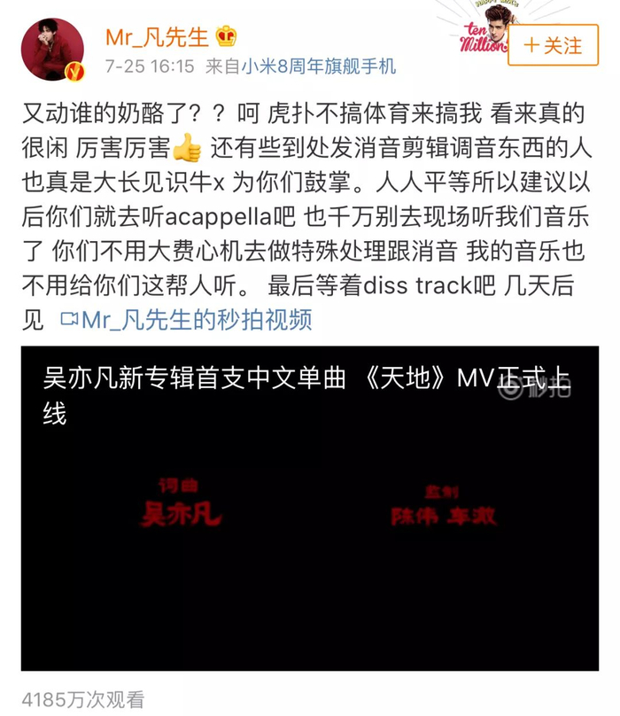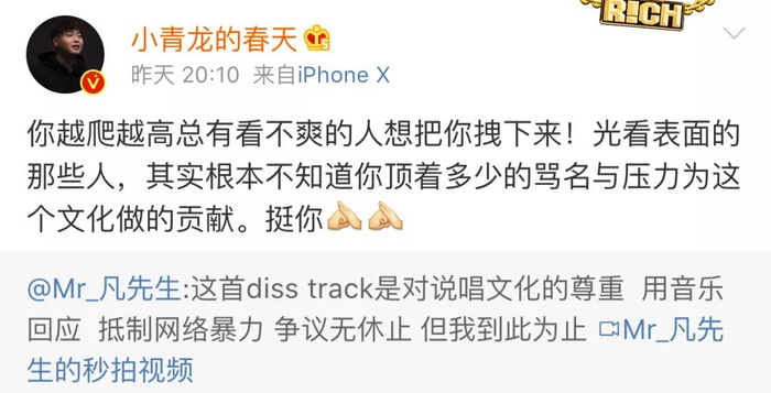 但吴亦凡正面回应了,他说他要出一个diss track作为回应。这就和骂战不一样了,这是作为rapper在音乐上的回应,围观群众纷纷搓手期待。