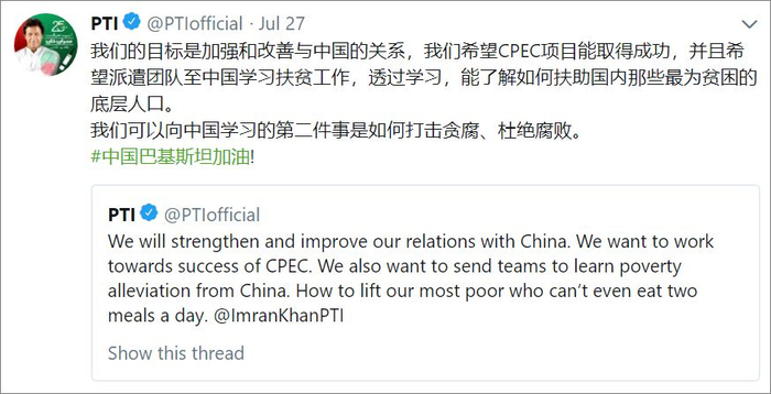 ▲ “我们的目标是加强和改善与中国的关系,我们希望CPEC项目能取得成功,并且希望派遣团队至中国学习扶贫工作,透过学习,能了解如何扶助国内那些最为贫困的底层人口。我们可以向中国学习的第二件事是如何打击贪腐、杜绝腐败。”从27日伊姆兰•汗用中文发的推特可以看出,继续加强对华关系仍是巴基斯坦新政府对外关系的优先方向。