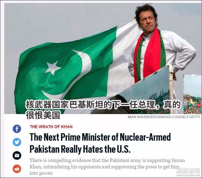 实际上,多年来,他一直是美国无人机袭击平民的尖锐批判者。在他看来,美国把巴基斯坦当作“受气包”,“美国的反恐战争使巴基斯坦损失了数十亿美元和数万人的生命。”美国媒体《每日野兽报》将其定义为南亚最反美的政客。▼