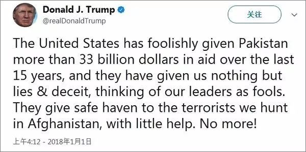 ▲ 特朗普1月发推文说巴基斯坦“除了谎言和欺骗,什么都没有,当我们领导人是傻瓜”。“他们为我们要在阿富汗抓捕的恐怖分子提供安全窝,根本不帮忙。再也不给钱了。”