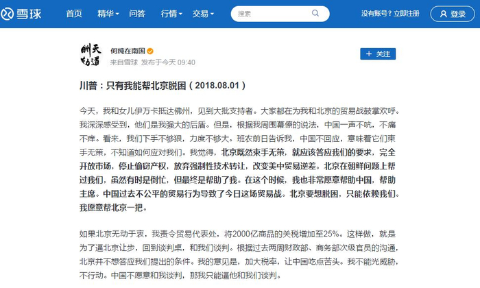 3日,一段有关特朗普“8月1日”在佛州演讲时,用大段篇幅和强硬言辞提及中美贸易的“报道”在网上流传,这一“报道”的标题称,特朗普宣称,只有他能帮助北京脱困。特朗普真的说了这些话吗?