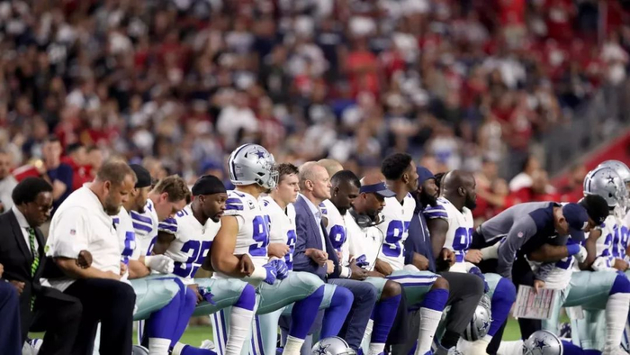 2016年美国橄榄球联盟(NFL)许多球员因不满国家对黑人的不公正待遇,在赛前奏国歌仪式中单膝下跪抗议。