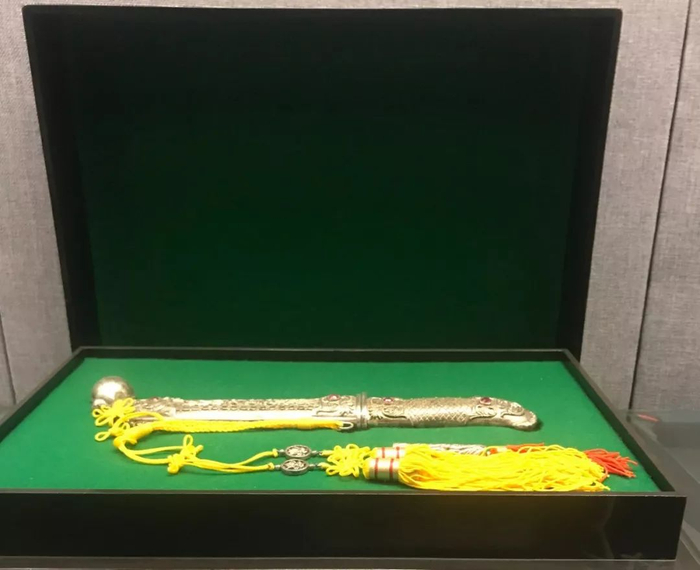 2005年10月,朝鲜人民赠送给胡锦涛同志的镶红宝石银匕首。