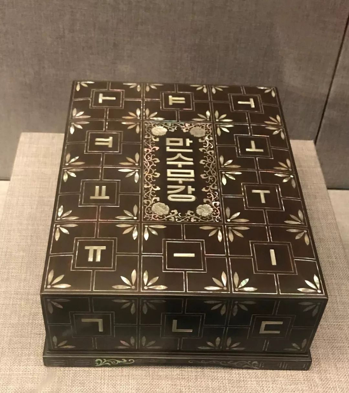 1953年11月,平壤市民赠送给毛泽东同志一个木胎黑漆嵌螺钿盒,以庆祝毛主席60寿辰。上面刻着四个大字“万寿无疆”,寄托了美好的祝愿。