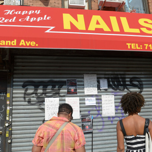 上周五,在纽约华人经营的“新红苹果”美甲店,一对非裔祖孙顾客来到店内消费。年轻的非裔女顾客因对拔眉不满意后,拒绝支付5美元的修眉费用。