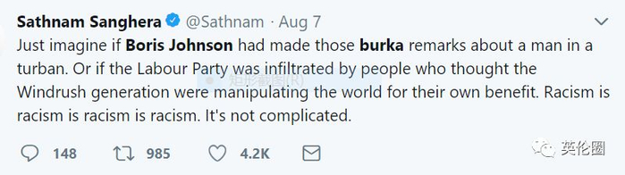 @Sathnam:想象下如果鲍里斯对男性Turban头巾发表同样的论调,或者如果他非要说工党已经被那些非法移民后代彻底渗透以便他们控制世界的话……种族歧视就是种族歧视,没什么好争论的。