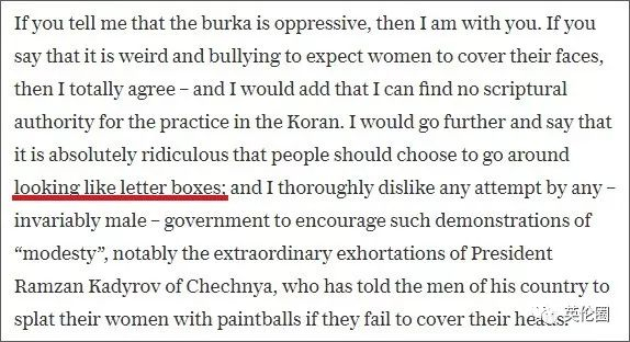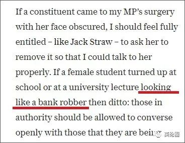 然而关键在于,他在正文中明确将穿着罩袍比作“看上去像邮筒”,还说穆斯林女性穿着罩袍出现在大学之类的公共场合,“很像银行抢劫犯”……▼