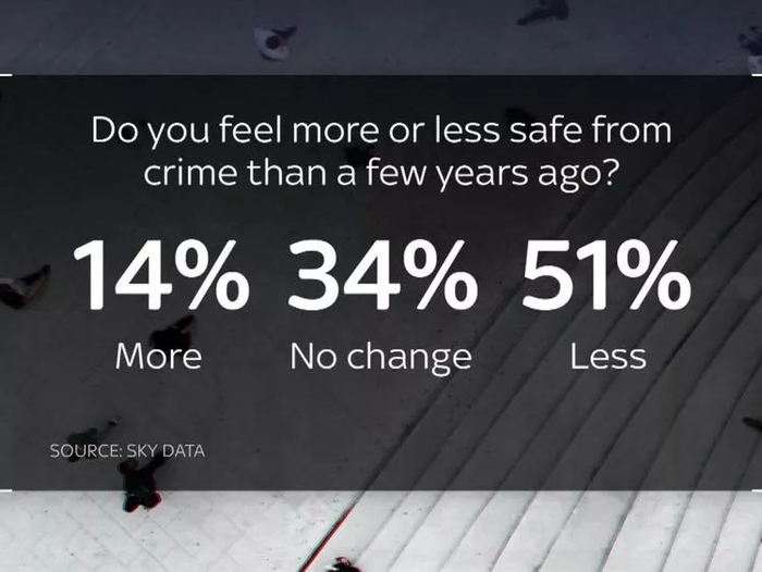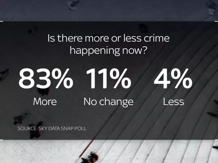 同样,83%的人认为现在的犯罪率比几年前要高得多,48%的人认为现在的犯罪率要高得多。