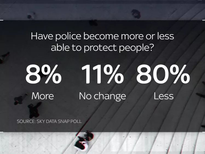 最近,英国天空电视台的一项民意调查显示,大多数英国公众现在觉得不那么安全了,近九成的人说警察没有足够的资金来完成他们的工作。