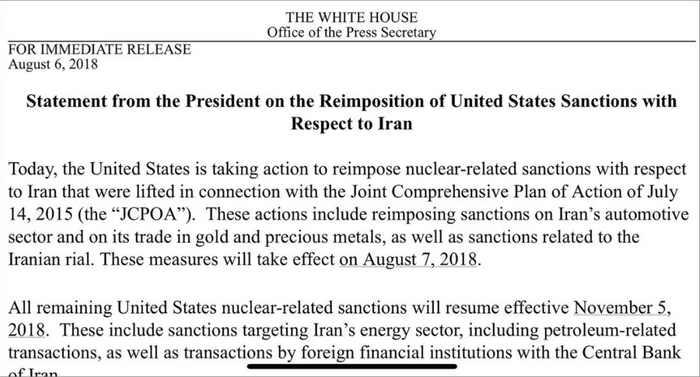 ▲ 美国政府8月7日正式重启对伊朗的经济制裁,首批制裁措施主要集中在金融、汽车、飞机等非能源领域,对伊朗经济至关重要的石油行业的制裁将于11月4日(1979年伊朗扣留美人质事件的日子)生效。