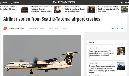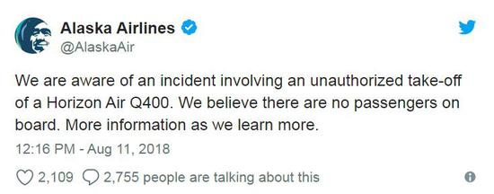 当地时间10日晚大约8时,阿拉斯加航空集团下属地平线航空公司一架庞巴迪Q400型客机“失窃”并被驾驶升空。