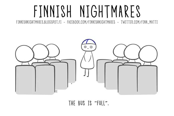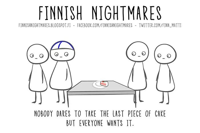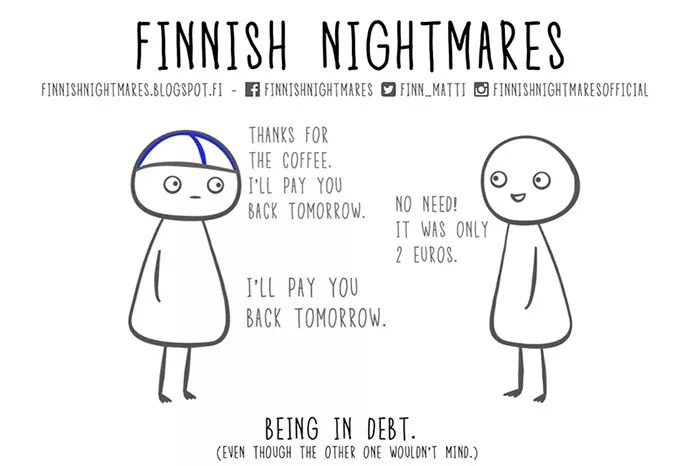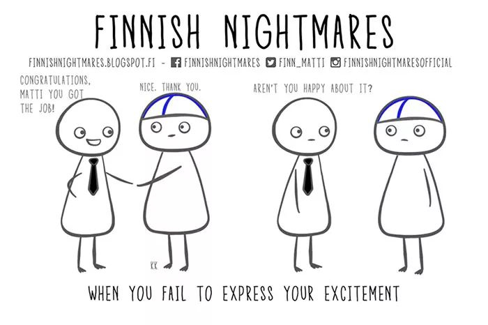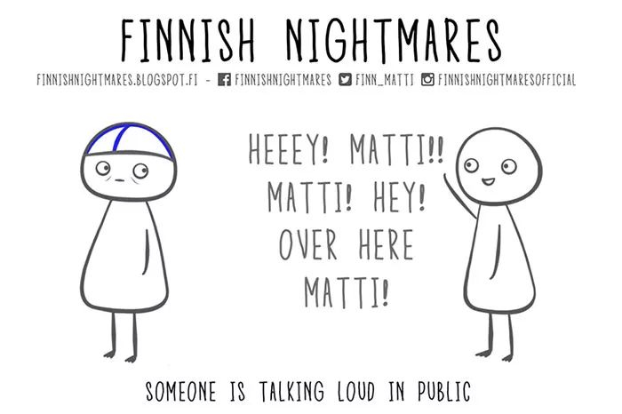 The term “jingfen” (精芬), or “spiritually Finnish”, is inspired by a comic from Finland called “Finnish Nightmares,” starring a cartoon figure named Matti who prefers minimal contact and avoids social situations。 “精芬”这个词源自于芬兰的一个插画绘本《芬兰人的噩梦》,里面的主人公马蒂不喜欢跟人接触,尽量避免社交。