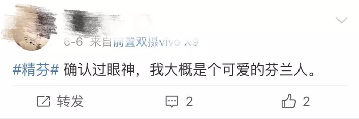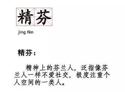 网民还造了一个汉语新词来形容这类人:“精芬”,或者说“精神芬兰人”。根据社交媒体上宽泛的定义,“精芬”基本上是指那种不喜社交的人,和芬兰人一样,把他们的私人空间看得“极为重要”。