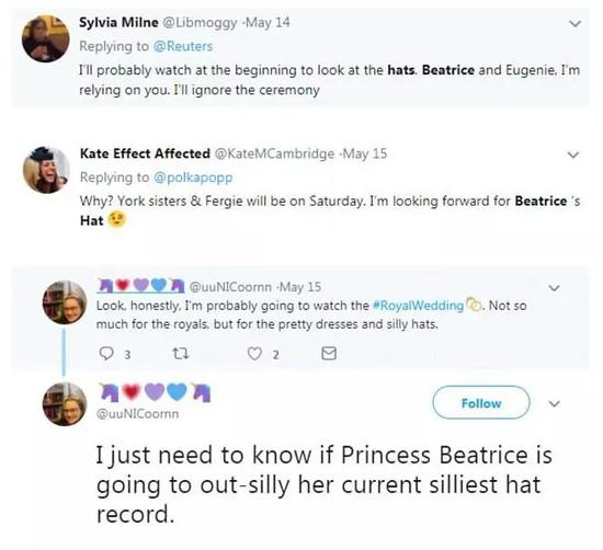 “对王室婚礼没啥兴趣,但为了碧翠丝和尤金妮的帽子,必须看直播~”