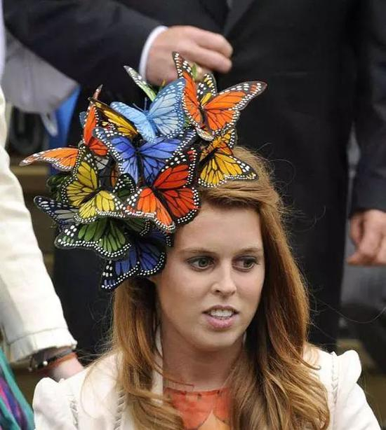 2008年,王室成员彼得·菲利浦斯的婚礼上,碧翠丝被吐槽“顶着一窝色彩斑斓的蝴蝶”