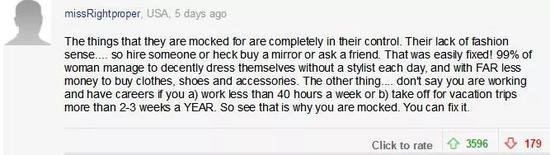 “被嘲笑,被恶搞,完全是因为她们自己没有审美能力和时尚感,还老是在大家面前晃啊晃。99%的女性都可以在没有造型师的指导,而穿着得体,并且花更少的钱,买更适合自己的衣服和配饰。”