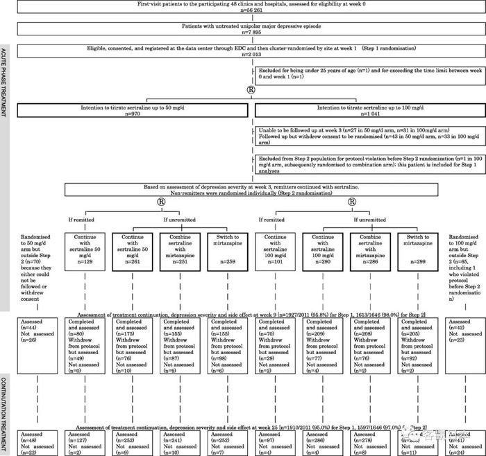 第一步,将患者随机分配为两组,分别服用舍曲林 50mg/天(970人)或逐渐增量至 100mg/天(1041人),用药至第3周。使用 PHQ-9 抑郁症筛查量表(评分0-27,评分越高抑郁程度越高)评价患者第9周的抑郁程度。两组评分之差为0.25,无统计学意义。
