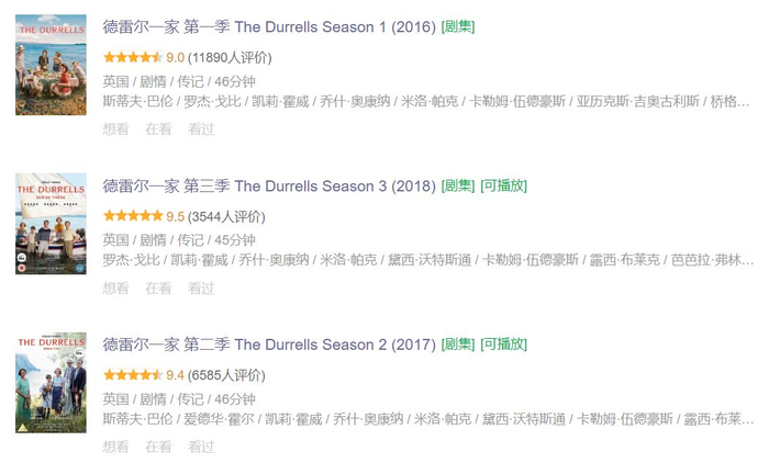 《德雷尔一家》是英国ITV出的一部剧,目前播出三季,共20集。它在豆瓣上每季评分都超过9分,三季下来分数不减反增,可以说是质量非常稳定的口碑好剧了。