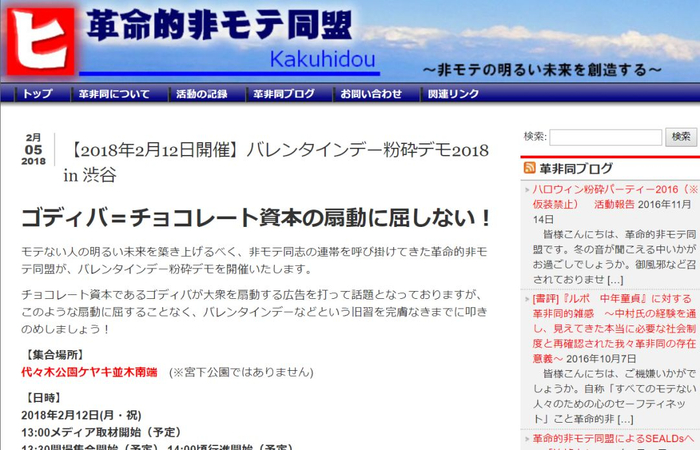 这让小编想起日本近几年每逢情人节必有的“粉碎情人节”活动出现。发起这个活动的组织叫“不受欢迎革命同盟”,已经成立11年了。他们不仅有自己专属的网页,而且每个活动都办得有声有色。