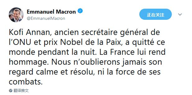 法国总统马克龙此后也发文表达哀悼之情:前联合国秘书长、诺贝尔和平奖得主科菲•安南在一夜之间离开了世界。法国向他致敬。我们永远不会忘记他那冷静而坚定的表情,也不会忘记他奋斗的力量