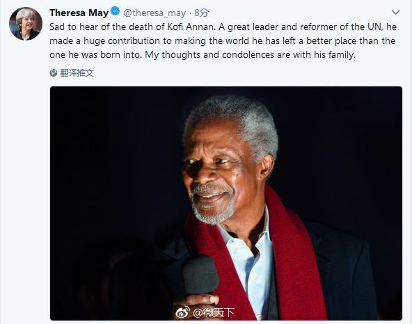 英国首相特蕾莎率先在推特上悼念安南,表达哀痛之情。