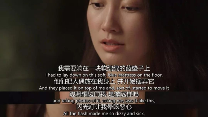 我需要躺在一块软绵绵的蓝垫子上,随后他们拿来一具与真人体积相当的人偶,他们把人偶放到我身上开始摆弄它,边照相边问我,是这样吗?