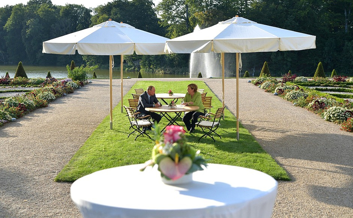 这个周末,普京在忙碌中度过,他18日先参加了奥地利外长卡琳·克奈尔的婚礼,并于当天晚些时候在柏林北部的梅塞堡与默克尔会面。在正式会谈之前,会德语的普京和会俄语的默克尔在无翻译在场的情况下,在湖边轻松“非正式会谈”。