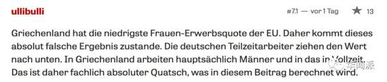 有网友认为这项统计数字是不科学的,因为“希腊的女性工作者是欧盟各国中比例最少的,在希腊,劳动者主要是男性,而且全职人数比例高,相对而言,德国的兼职人数非常多,这大大降低了平均工作时长。”
